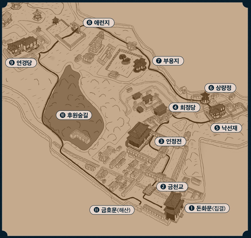 국가유산진흥원 에서 추천하는 창덕궁 달빛기행 동선입니다. 아래와 같이 산책을 하게 되시면 크게 다 둘러 보실 수 있습니다.