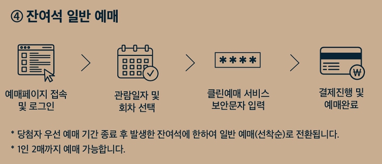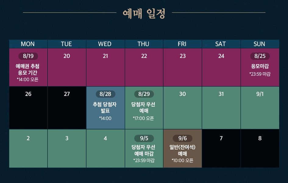 8월 25일 선응모 기간이 끝난 후 예매 마감이 되었는데요. 이후 잔여석 예매를 9월 6일부터 하실 수 있습니다.