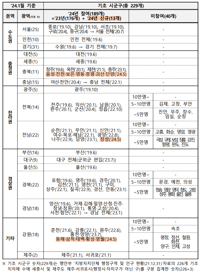K패스는 현재 189개의 지자체가 참여할 계획으로 인구수 10만명 이하인 지자체가 일부 빠지게 됩니다. 현재 주요 지차제인 서울, 인천, 경기, 대전, 세종, 광주, 부산, 대구 등 176개의 지차제가 참여가 완료 되었고 동해, 삼척, 태백, 횡성, 영월, 음성, 진천, 보은, 영동, 증평, 괴산, 단양, 장성 13개 지자체가 추가 되었습니다.